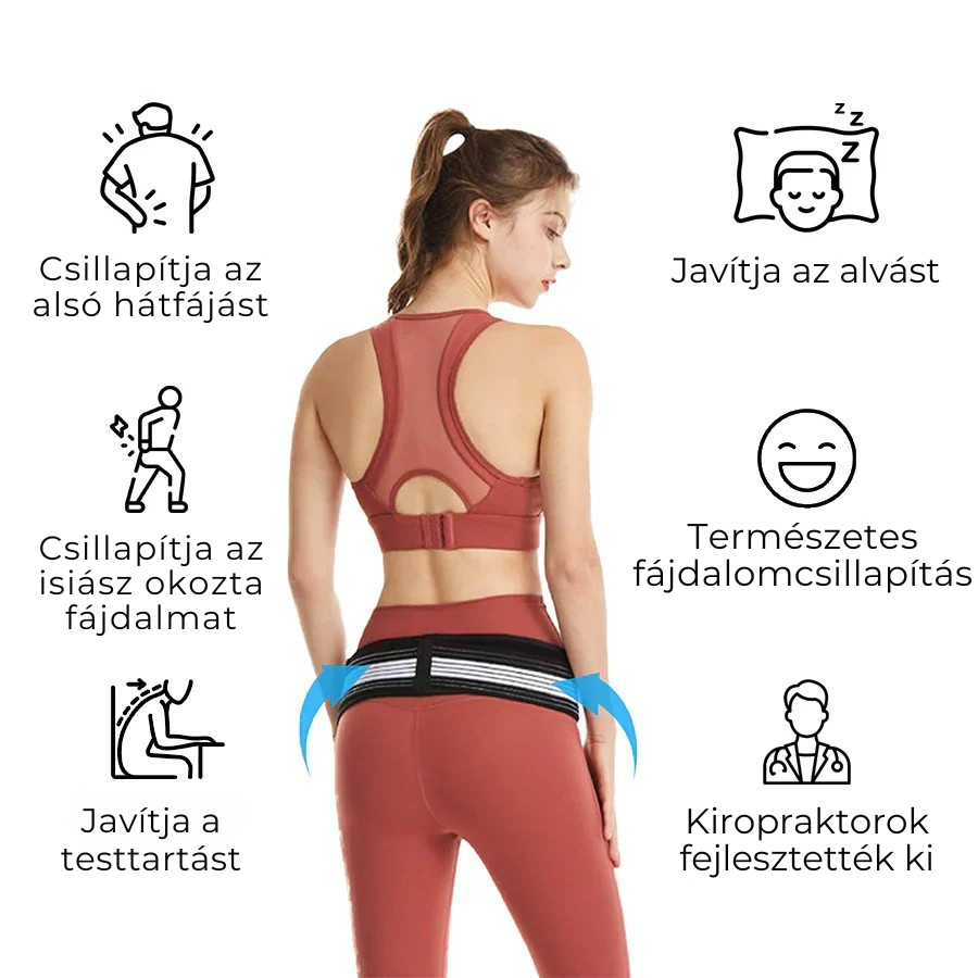 A célzott kompresszió erejét kihasználva az öv stabilitást biztosít a gerincnek, és fokozza a tápanyagban gazdag véráramlást a derék- és csípőtájékban. Ez beindítja a test öngyógyító mechanizmusát, szinte azonnal enyhítve a derékfájást, az isiászt és a csípőfájdalmat.